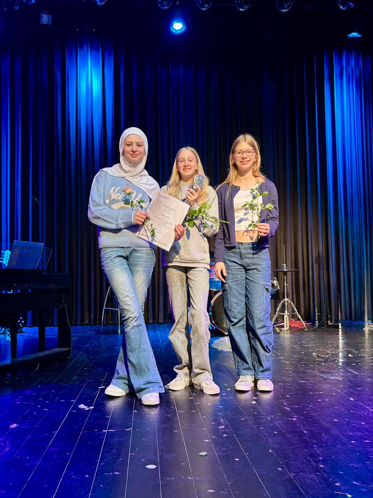 Laura Bobe, Kefah Hamwi, Stella Stieper (alle 7a) und Noah Stieper (ehemals 6a, nicht im Bild) haben beim Bundeswettbewerb Fremdsprachen 2025 mit ihrem Team “Fantastic Friends” einen vierten Landespreis gewonnen!