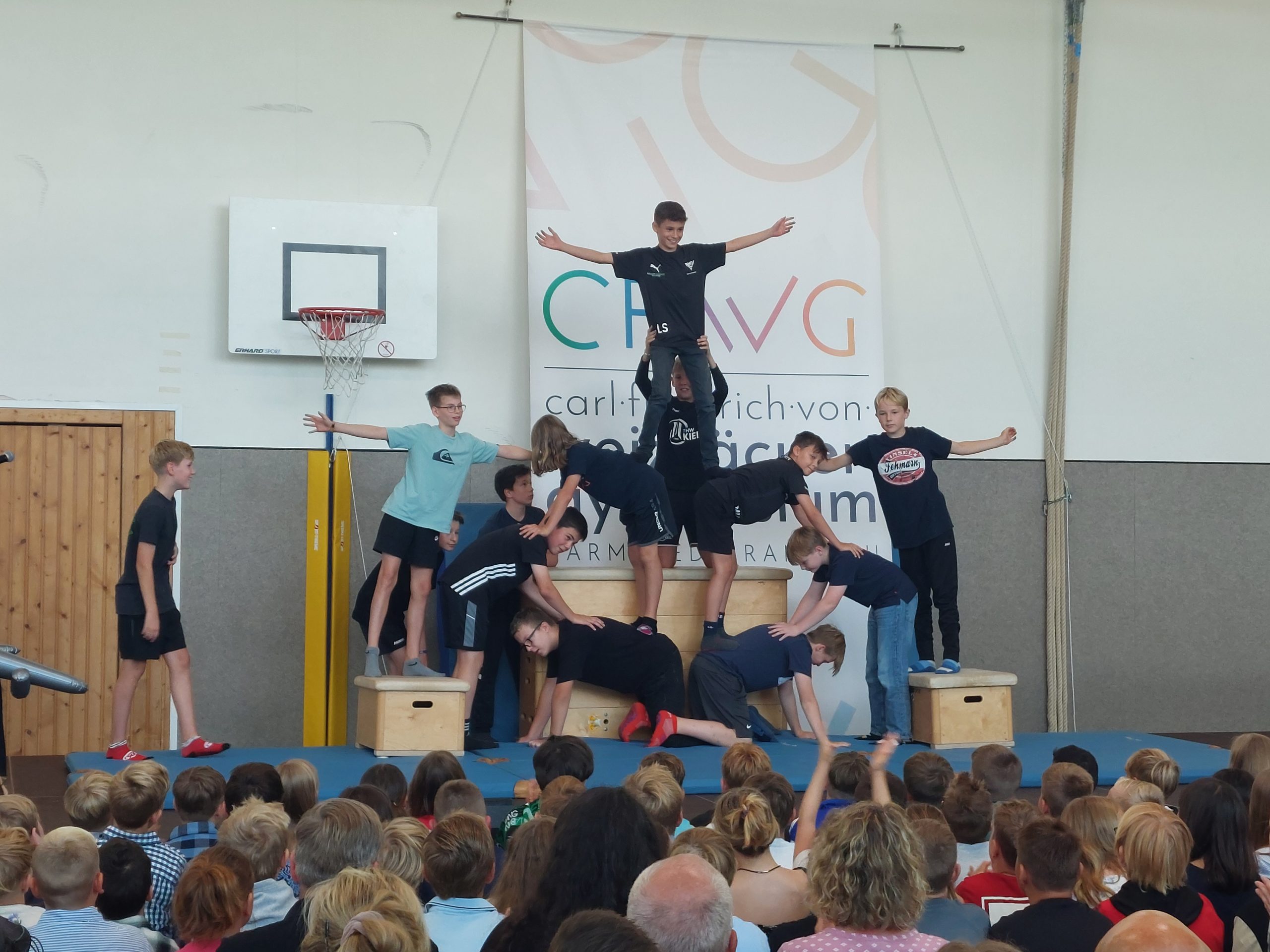 Als 2. Unterhaltungspunkt führte die ehemalige 6b Zirkuskunststücke auf. So wurden hohe Schülerpyramiden blitzschnell und mit sichtbarer Begeisterung gebildet.