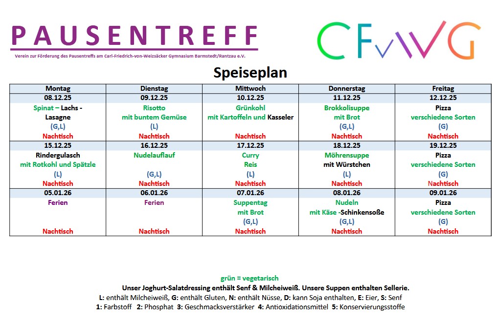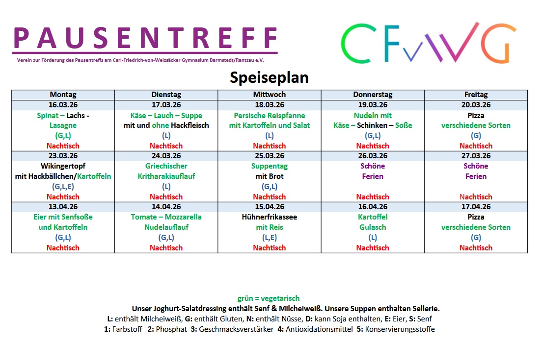 Zusätzlich gibt es jeden Tag in der Zeit von 12.35 bis 13.00 Uhr ein leckeres Mittagessen oder auch vorbestellte Salate. Im untenstehenden Speiseplan erkennt man schnell: Gesunde und abwechslungsreiche Küche ist hierbei das Motto. Vegetarische Gäste kommen außerdem jeden Tag auf ihre Kosten, denn hier gibt es weit mehr als Beilagen. Und der „Pizzatag“ am Freitag hat bereits Tradition und wird gerne gewählt – auch von unseren Lehrkräften!